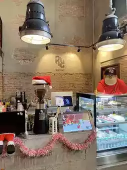 Rundcomf • A loft-style coffee shop with exposed concrete in Bangsaen area. The shop is decorated in a loft-style with exposed concrete, giving a cool feeling. We went during Christmas. The shop is decorated cutely and does not deviate from the theme of the shop.