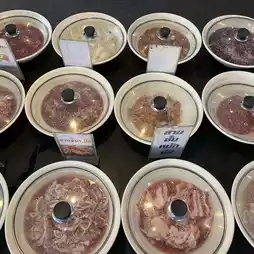 Always refilling, has pork belly, various types of marinated pork, shrimp, fish, squid
