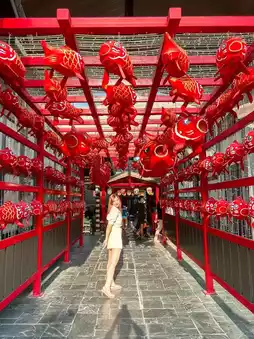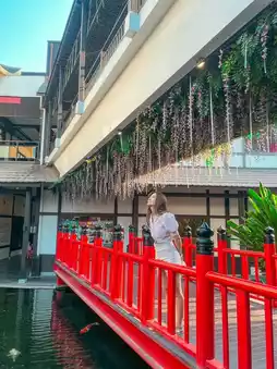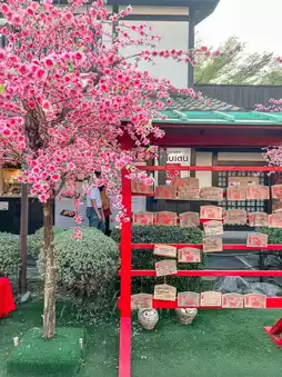 Here, everything is modeled like Japan, even the golden pagoda, the red bridge, and now they are holding a cherry blossom festival in the park. The pink cherry blossoms are in full bloom, like walking in a real Japanese garden. It's even better if you can sit and have a picnic and eat snacks next to the cherry trees in the evening when the sun is not hot and the weather is nice, like sitting and having hanami in a beautiful Japan.