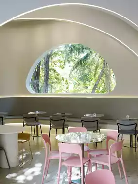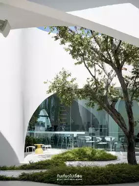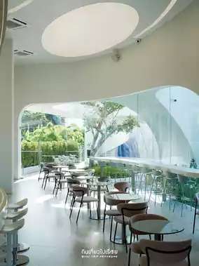 The coffee shop area inside is a glass room that plays with the curves as well. The recommended menu is Khao Lam coffee, which uses the famous food of Chonburi Province to design it into a drink menu. Overall, we think it is quite creative. Or if anyone wants to try a general coffee menu, there are also many items such as hot latte, orange coffee, and various mocktails to choose from. Including bakery, croissants, cakes and cookies🍰🍪🥐