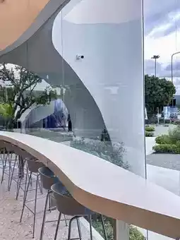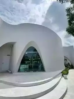 UNCLOUD Coffee is a cafe that is very popular right now. It can be said that anyone who comes to visit Bangsaen must definitely stop by. The location is good on the roadside. It is a 100% pass-through, especially on the way back to Bangkok. And what is most special is that the shop has just received the 5 5 Cafes with outstanding design Award Of Attractive Space on Room x Living ASEAN Selected Awards 2024. The concept of the shop is an area under the northern lights. It is striking with pure white walls. Adding a playful touch is the various curves that connect well to the sky. There is also a zone that looks like a large sparkling purple cliff. There is a staircase leading up to the 2nd floor for taking chic photos.