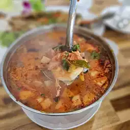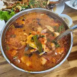 Tom Yum Talay Nam Khon, the taste is just right for tom yum. There are a lot of tom yum ingredients, such as large shrimp, squid with eggs, sea bass.