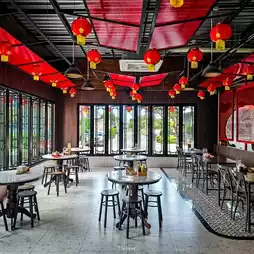 The restaurant is decorated in Chinese style. There are many seats to eat in the restaurant.