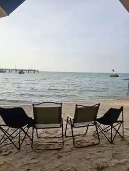 A secret cafe on a small island in Bangsaen. This is a small cafe by the sea on a private beach. It will be an open-air zone. Sit and relax by the beach. There is a cool breeze. It's great. This place is pet-friendly.