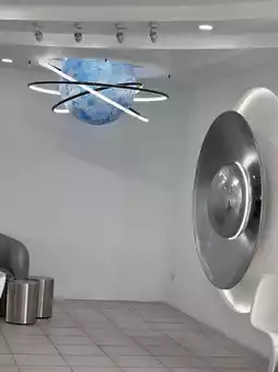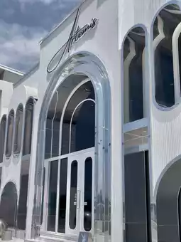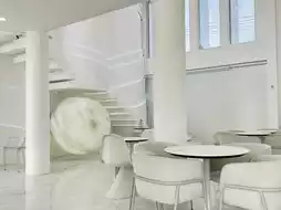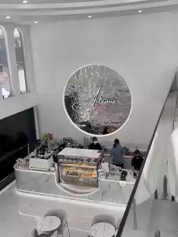 💡 Style: A clean, minimalist white-toned cafe, blended with luxury through marble designs and warm lighting.