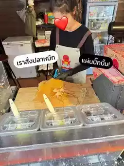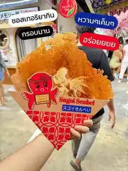 😋 When you come to Bangsaen Fish Market, how can you miss this popular snack! "Sugoi Sembei", a famous snack from Mille Mille, feels like a crispy crepe at home, but the filling is squid and you can spread it with your favorite sauce~