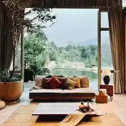 The cafe is surrounded by nature, with a lake and small hills nearby. The decor emphasizes earth tones and wooden materials, creating a warm and relaxing vibe. There are plenty of photo spots, such as an outdoor piano on an island in the middle of the water.