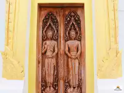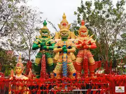 Located in Wat Saensuk, Chonburi Province, this beautiful pagoda stands out with its four-colored Naga staircase surrounding the four directions. Each direction has a different color of Naga, such as green, gold, yellow, blue, and navy blue, creating a beautiful and unique look. Inside, there are relics from Sri Lanka and a golden Buddha statue in the middle of the dome. The atmosphere is peaceful.