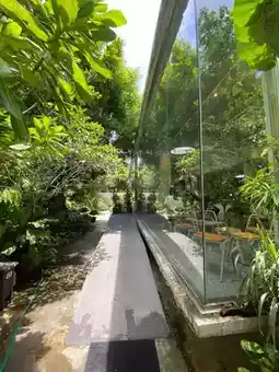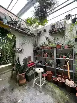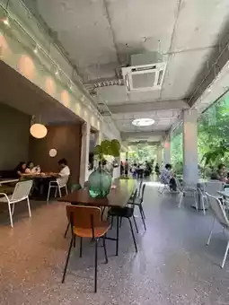 A minimalist loft-style cafe in the middle of a garden, hidden in a shady natural atmosphere. The shop is a bare concrete building combined with large glass windows, allowing natural light and a perfect view of the green garden. Very chill, for those who like to come and work, I recommend it. 🌿