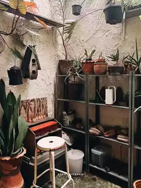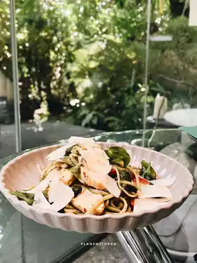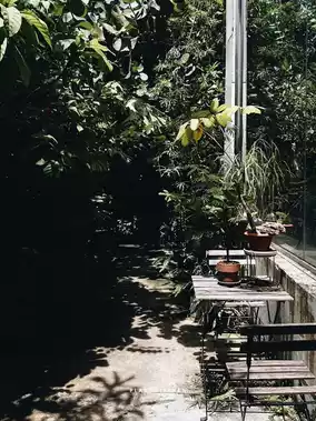 The shop is a cement loft with a green atmosphere, very shady. There are many foods, desserts and drinks to choose from, such as Apple Ginger Sparkling, very refreshing, very fizzy, with a hint of ginger.
