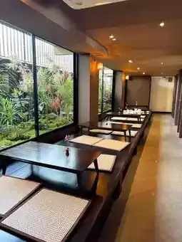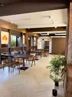 The atmosphere is great, with plenty of seating and photo spots, surrounded by trees.