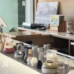 The interior is simple and clean, with a wood-grain theme. The quiet space is perfect for reading or working. The warm atmosphere, reminiscent of a Japanese tea room, will soothe your soul.