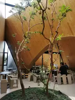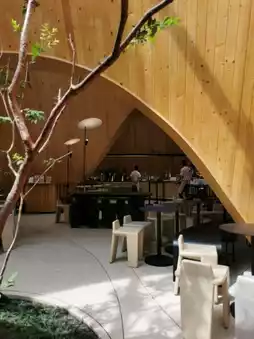 The shop's design is beautiful, both inside and out. It's strikingly unique, making you instantly recognizable. The exterior is dark wood, seemingly closed and opaque, but upon entering, you're greeted by large trees nestled within the building, flooded with natural light. The interior is airy and beautifully lit, bringing a sense of nature to life. The stone furniture complements the space perfectly. Drinks and desserts are a bit pricey, but if you're looking for a beautiful cafe, I highly recommend a visit.