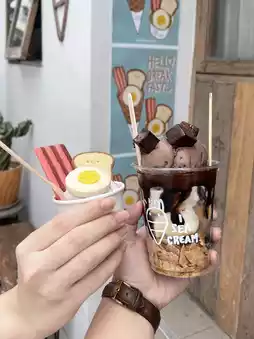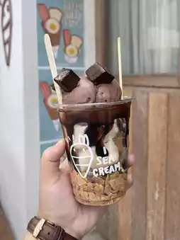For example, we ordered the Hello Breakfast (119 baht). It comes with one scoop of ice cream of your choice, served with cookies shaped like toast, bacon, and a fried egg. So cute! 😆🫶🏻 Another menu item we ordered was the Fudgy Brownies (99 baht). It was delicious and the chocolate was rich. However, it was extremely hot when we went, so the ice cream melted quickly, so we had to eat it quickly.