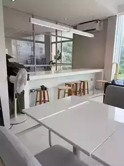 SOURCREAM FACTORY is decorated in a minimalist loft style with white and wood tones. Natural light streams through the large windows, creating an airy, spacious, and comfortable atmosphere. There are both air-conditioned and outdoor areas, perfect for working, relaxing, or taking cool photos.