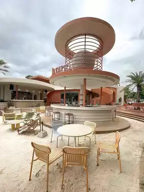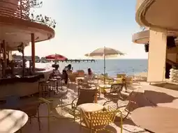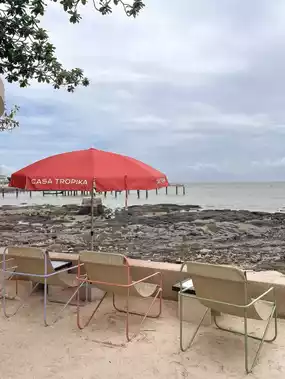 This is both a cafe and a beachfront restaurant in Bangsaen. The shop's unique decor, featuring vibrant orange accents, makes for a beautiful photo opportunity from any angle. There are both indoor and outdoor seating areas, and a variety of seating options. If you're looking for a beachfront restaurant with a sunset view, we highly recommend this place. The evening light is perfect, and you can sit back, listen to the soothing sound of the waves, and enjoy a cool drink. The shop has great music, a great atmosphere, and a full selection of delicious drinks. The menu offers a wide variety of dishes, beautifully presented, and great photos. Prices are a bit high, in line with the touristy area. It's suitable for all ages. Photography enthusiasts shouldn't miss this place.