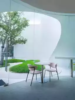 into the shop's curved, white shape, resembling the flowing lines of the Northern Lights. It's beautifully iconic and unique.