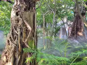 A lush artificial forest: Stepping into the space feels like you've been transported to another world, filled with a variety of trees and lush moss, creating a cool and refreshing sensation. The gentle mist gently emanates from the heat.