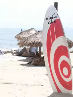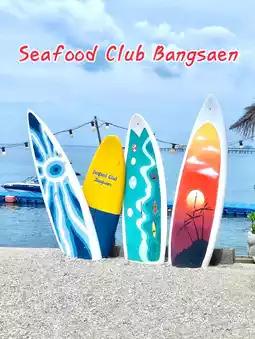 Seafood Club Bangsaen is a seaside restaurant and cafe serving seafood, seafood, and various drinks. The restaurant's decor is so lovely, it's like Miami Beach has been renovated. There are plenty of photo spots, spacious tables, and seating. You can also choose to sit by the sea, listening to the sound of the waves, and the atmosphere is wonderful. There are kayaking activities, a swing, and sunset viewing platforms. It's the ultimate blissful and fulfilling day.