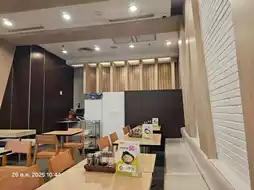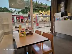 🪑 Spacious seating, not cramped, with a glass-fronted area offering a lively view of the mall outside.