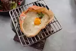 Grilled crab roe in the shell with oozing eggs, blue crab papaya salad