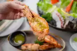 Grilled river prawns with seafood sauce, Wagyu beef