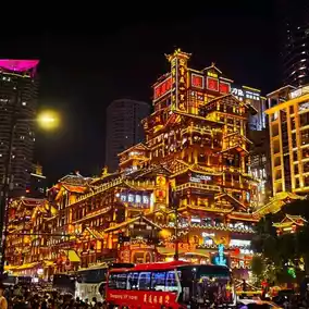 super spectacular scene at night at hong ya dong, the famous beautiful building the lights up at night. went at around 6pm and waited for the lights to turn on! amazing view!!