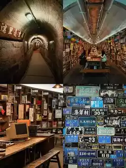 A bookstore located inside an air-raid shelter, filled with old objects and following a nostalgic theme.