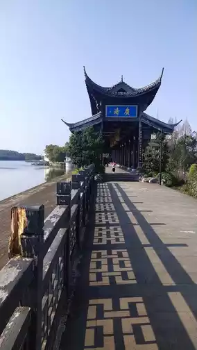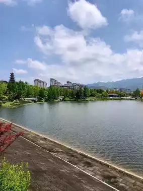 The entire Shuanggui Lake is very large. It is about 10 kilometers to walk around the lake. There are sightseeing cars for rent in the park. In the distance, there are towers, terraced fields, and other scenery.