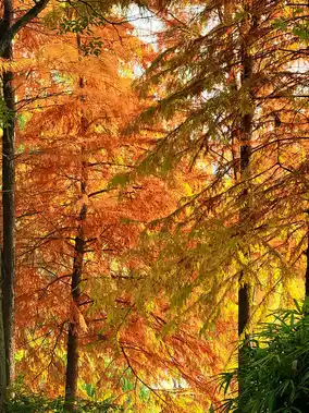 The colorful metasequoia trees and the lake and mountain scenery complement each other