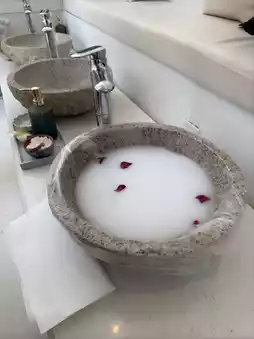 The experience began with a milk foot bath, a unique start that delighted me. The warm milk gently caressed my feet, its soft touch instantly melting away my fatigue.