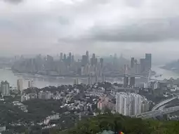 An urban forest oxygen bar with lush greenery, offering a bird's-eye view of the Jialing River and the passing monorail