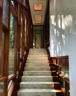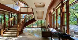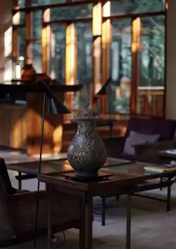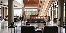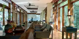 1. As the car entered Jinyun Mountain, I began to imagine the Banyan Tree's riverside complex. Despite having done some research beforehand, I couldn't help but envision its secluded and tranquil setting. Upon arriving at the parking lot, a golf cart to the hotel lobby was already waiting. Like all the guest rooms, the hotel lobby faces the Jialing River, with views of the verdant mountains. Floor-to-ceiling windows bring every visible scene into view. Surrounded by lush greenery on all sides, the lobby offers a picturesque experience.