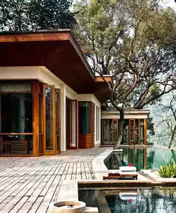 🌳 Banyan Tree Hotel, embedded between cliffs and ancient trees, offers close-up views of the meandering river and distant vistas of rolling mountains.