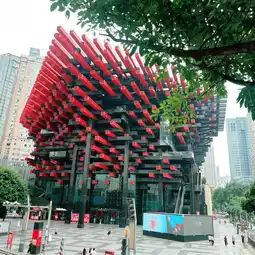 • Unique design – The exterior structure consists of long red and black beams designed to resemble "chopsticks" or striking wooden frames, becoming a landmark of the Jiefangbei district, evoking the feeling of ancient Chinese people embracing the power of heat.