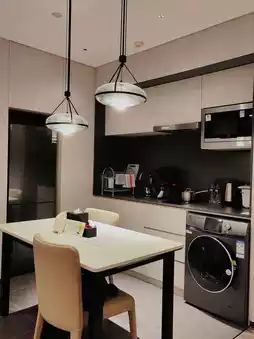 The camping suite is very family-friendly in terms of size, nearly 60㎡. The circular layout ensures flexible space and interaction, while the door connecting the living room and bedroom allows adults to work without being disturbed by kids playing. Beyond the fun theme, as a serviced apartment, the room is fully equipped with kitchen facilities: a dual-function fridge, microwave, washer, pots, kettle, and even small details like dish soap and laundry detergent are provided. It’s clear they’ve thoughtfully considered the daily needs of long-term guests.