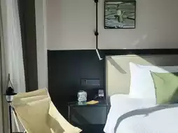 The breakfast deserves special praise. The hot dishes included seafood, which was definitely a unique highlight of their breakfast spread. The presentation was also well-plated, making it visually appealing at first glance. The restaurant’s decor was vibrant, with low-saturation green and brown as the main color palette. The gentle morning sunlight streaming onto the glassware on the long table made for a delightful start to the day.