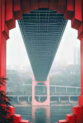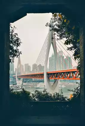 π: "Chongqing Sunyata Resort Hotel," where the arched doorway frames the majestic Yangtze River Bridge.