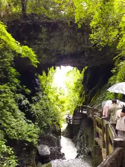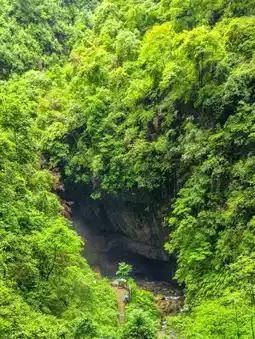 The walking trail in Longshu Gorge, located in Chongqing, China, is well-maintained, making it easy for anyone to take a leisurely stroll. The path is covered with wooden decks and winds along the valley, offering a perfect distance—not too short, not too long. As you walk, you'll see rare plants, moss, and ferns growing between the cliffs, and occasionally, small streams trickling down from the cliffs might touch your face.