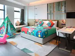 🎈Here are the adorable "Smile! Little Alien Beasts" parent-child themed rooms. Stepping into your room will make you feel like you've entered the magical realm of alien creatures. The soft, cartoon-inspired bedding will ensure your child sleeps sweetly every night. Specially equipped with children's toiletries, a bathtub, and a footstool, every thoughtful detail provides exclusive care for your child. Even more delightful, there's a wide selection of toys and books, creating a haven for children where knowledge and fun meet.