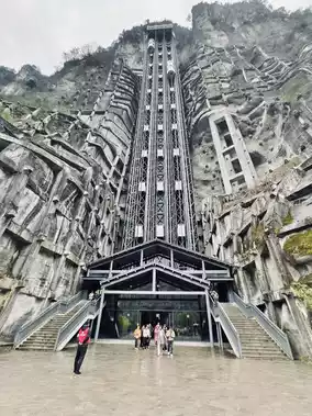A massive sightseeing elevator plunges straight into the canyon, resembling a scene from a sci-fi movie.