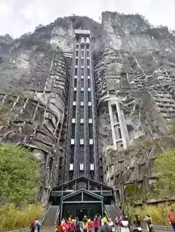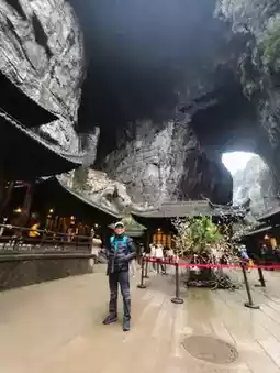 Visitors can take an elevator or walk down to the valley floor, where they can admire the canyon, stone bridges, cenotes, and the Tianfu Official Posthouse.