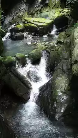 A suspended wooden plank road built along the sheer cliff! Below your feet is a clear green stream