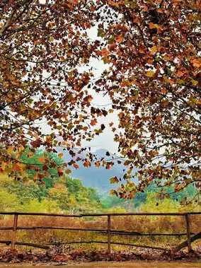 The hills covered with alternating red and yellow leaves are breathtaking