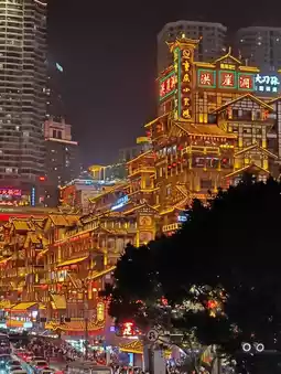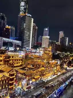 英文TIPS推荐洪崖洞:想要感受重庆的真实氛围,一定要去洪崖洞看看,令人惊叹的夜景结合了悬崖峭壁上的中国古代木质建筑和河面映照的耀眼摩天大楼,但是,要做好人群的准备!晚上,整个区域都挤满了人,尝试一些当地小吃,如辣面、烧烤串、臭豆腐,完全值得在热闹的同时漫步其中的热闹场景。