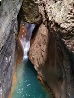 The canyon stretches 5 kilometers, with approximately 2 kilometers accessible for visitors. It comprises three sections: the entrance gorge, a tunnel through the middle section, and the exit gorge.