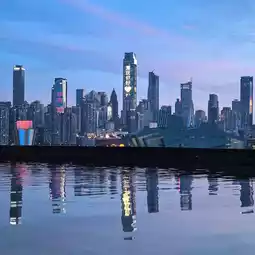 - The "CHONG QING" neon sign reflected in the fountain creates a fantastic mirror shot blending with the nightscape.