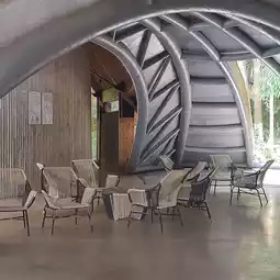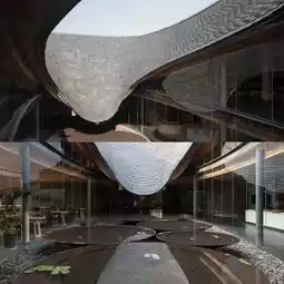 The green-tiled house that hovers over the rural fields is supported by a lightweight steel and wood frame, with an inwardly overlapping circular green-tiled roof. A 70% high prefabrication rate also achieved a very short construction period of 52 days for the main building, interior, and landscape. The spiraling roof naturally forms two inward courtyards, providing rich landscape layers for the interior. The relationship between inside and outside, bamboo and tiles, new and old is encapsulated under the 'invisible elephant' roof.