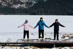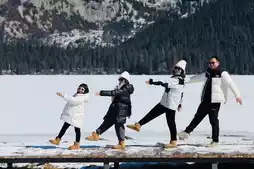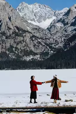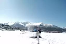 A young lady enjoys the entire snowy mountain alone in the snowfield