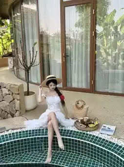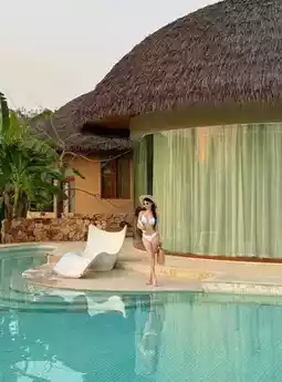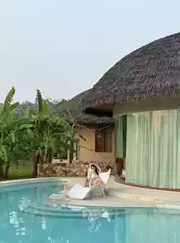 Thatched roof, ins style pool, tropical rainforest,